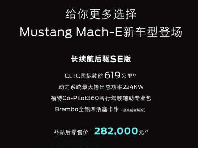 按现有的补贴政策,Mustang Mach-E长续航后驱SE版只要价格进入30万就可以拿到国家补贴,而实际上长续航后驱SE版的补贴前售价已经极其接近30万元了。