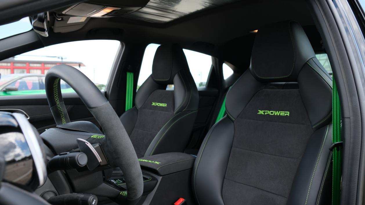 一上车,首先吸引我目光的便是骚绿色的绿色安全带,中控台、座椅以及方向盘绿色缝线,潮流范儿溢满了整个车厢。平底方向盘,骚气的SUPER SPORT按键,大量Alcantara和麂皮的运用,无处不在的XPOWER标识,让车内充满战斗气息,想必没有『骚年』会不心动吧。