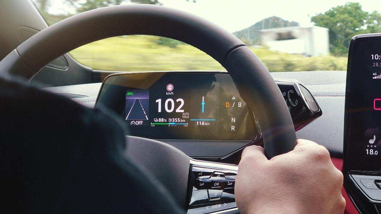 从远处看,全天候自适应的车灯IQ. Light,带有人性化的迎宾唤醒/离车休眠光效。前脸个性简约的轮廓主体搭配贯穿式点亮灯效,宛如镀光一般引人瞩目,定义ID. 式的独特未来感。来到车内,映入眼帘的AR-HUD将科技感、未来感直接拉满,与仪表、中控屏形成三屏互动,指示清晰,即使在复杂的城市道路中,也能保持对车主的精确导航。