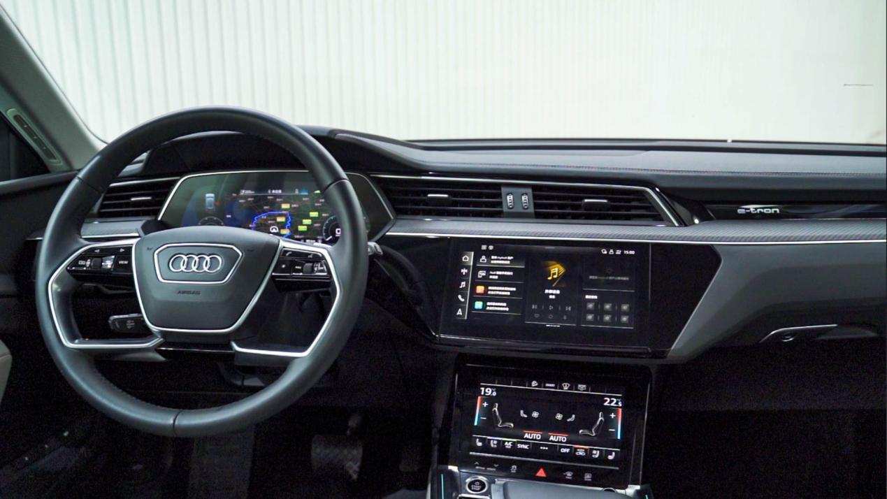进入e-tron的车内,最引人注目的就是“三联屏”设计。这套“三联屏”来自奥迪全新的数字座舱,配有MMI系统、车载互联系统和智能辅助驾驶系统以及HUD抬头显示系统。其实,现如今的新能源汽车都早已高度配备了大屏幕,甚至某些品牌的屏幕大到夸张。但使用过的朋友都会有一个明显的感受:大屏幕用起来不顺手,屏幕靠近副驾驶一侧的功能需要将手伸远才能迎合。而奥迪的“三联屏”刻意的向驾驶员一侧进行了倾斜,可以让用户非常轻松地控制信息娱乐系统和众多驾驶辅助功能。另外,奥迪e-tron的触摸屏还带有触感反馈功能,虽然这一功能很轻松就能实现,但这也体现出了奥迪这个百年车企对用户需求的洞察。试想一下,如果没有触感反馈功能,在使用屏幕的时候我们无法得知是否按到了位置,还需要看一眼,岂不是让便利性变差了?同时,奥迪e-tron还配有3D全景影像技术。这一项技术在一些狭窄的胡同、停车场就显得特别实用,用户可以通过手指挪动屏幕上的画面,查看周围的障碍物。为用户提供了更加全面和安全的引导。