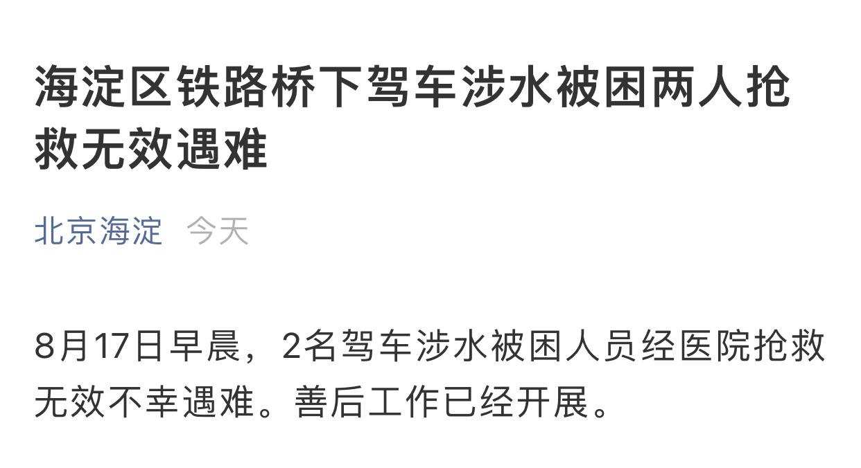 8月16日晚21时许,北京市局地突遭强降雨过程。海淀区旱河路铁路桥下短时严重积水,一辆路过汽车被困,车内两人经救援人员和群众救出后,由120及时送往医院救治。8月17日晨,据“北京海淀”微信公众号消息,两名驾车涉水被困人员经医院抢救无效不幸遇难。善后工作已经开展。
