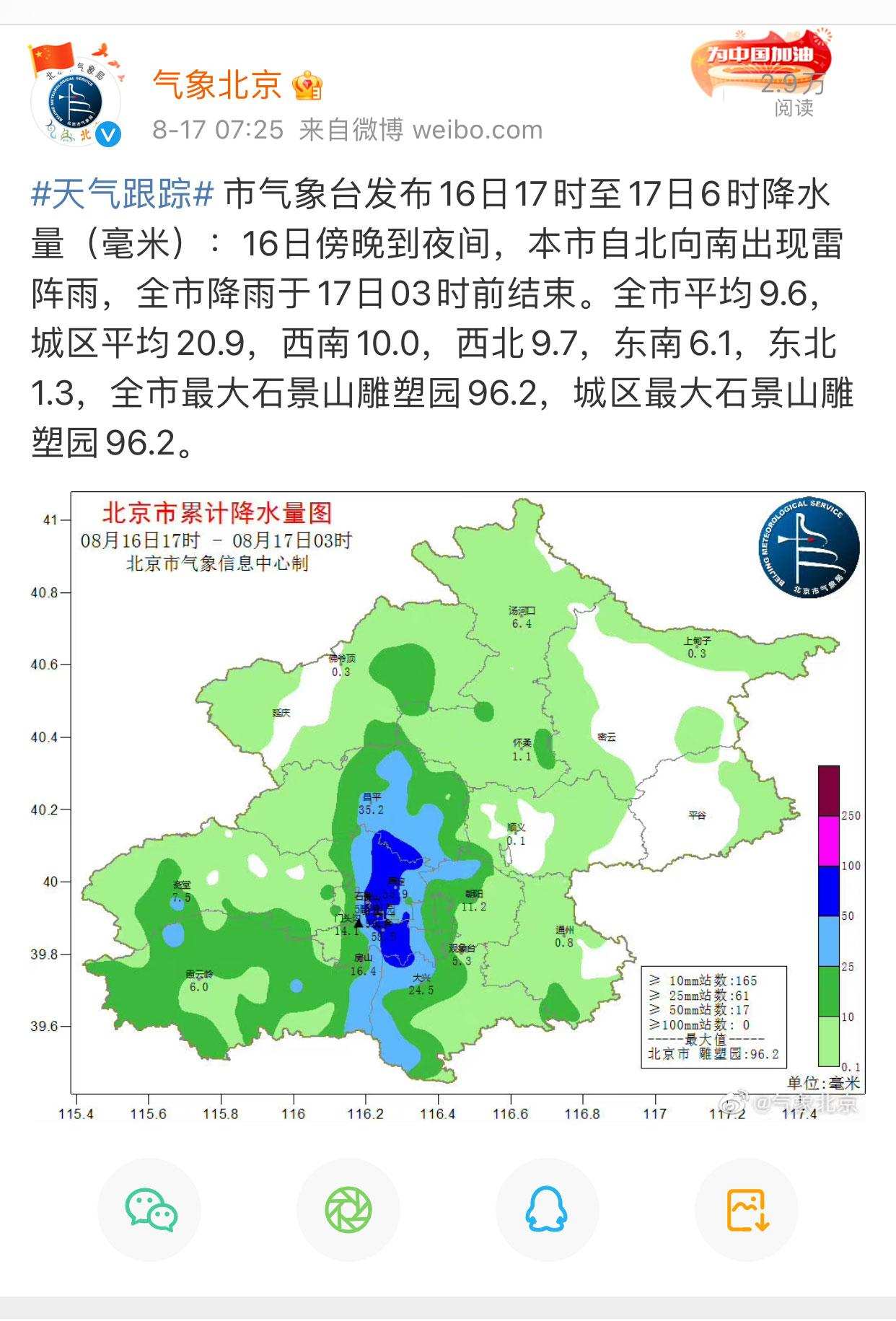 据“气象北京”官方微博消息显示,此次全市平均降雨量9.6毫米,城区平均20.9毫米,西南地区10.0毫米,西北地区9.7毫米,东南地区6.1毫米,东北地区1.3毫米,全市最大降雨量96.2毫米,出现在石景山雕塑园。