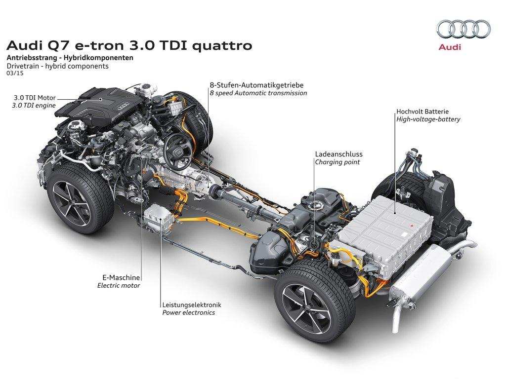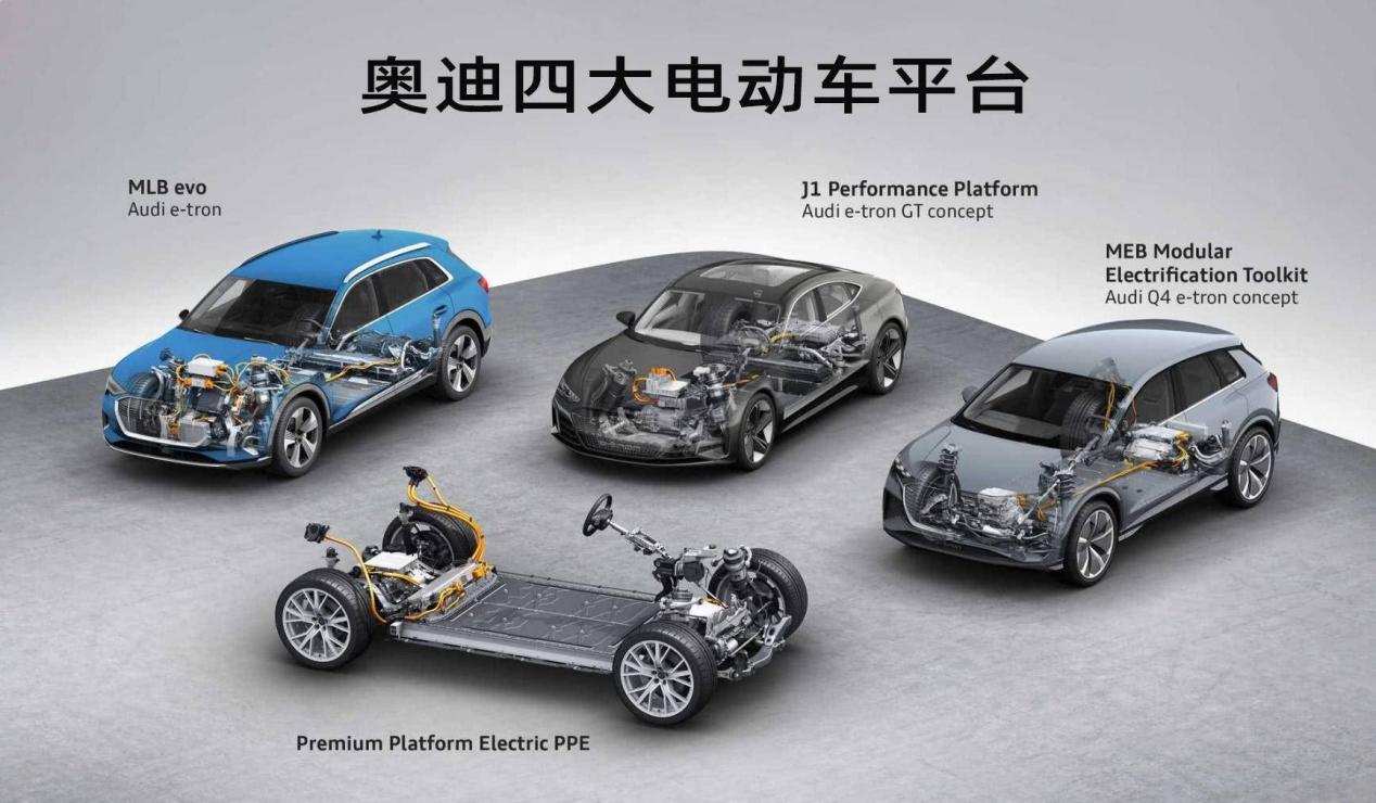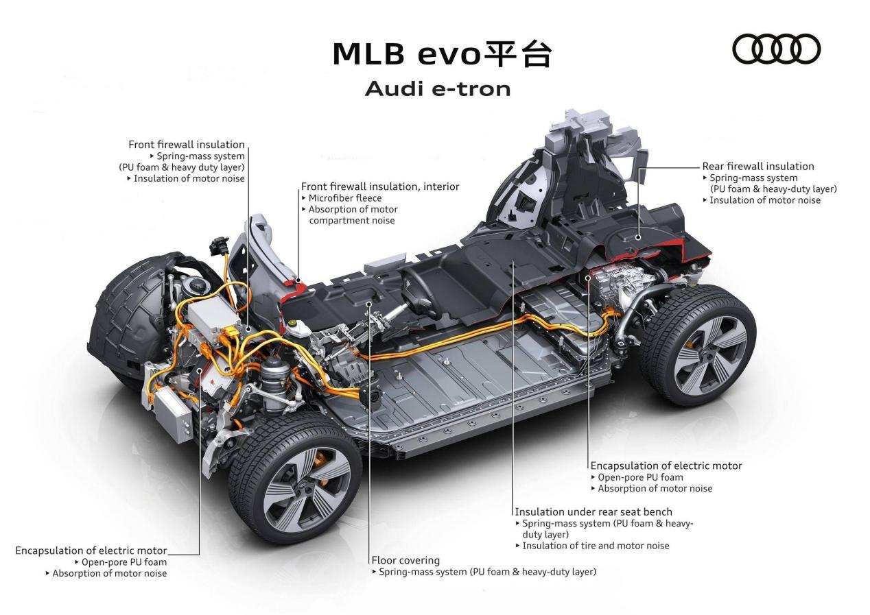 通过上面的历史回顾,我们可以看到,奥迪一开始的目标指向是纯电动车,可后来却将更多的注意力放在了混合动力车上。接下来将从底盘结构、驱动系统、电池技术三方面讲解一下e-tron系列的纯电与混动两款车型:e-tron和Q7 e-tron。