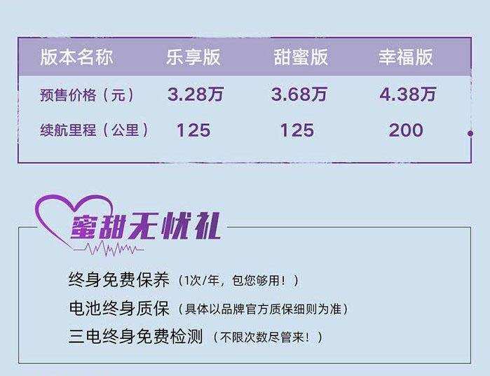 从官方获悉,奇鲁汽车首款车型ec1正式开启预售,共推出3款车型,预售价格为3.28-4.38万元。此外,该车有三项购车权益,其中包含终身免费保养(1次/年)、电池终身质保(具体以品牌官方质保细则为准)和三电终身免费检测(不限次数)。