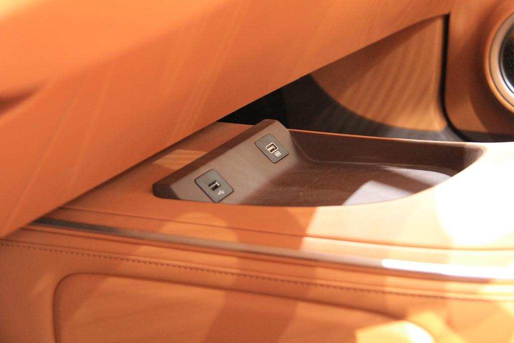 在悬空平台的下方,很多人可能会觉得闪电猫也会和很多车型一样做成巨大的储物槽。不过实际上这个部分只有一个小型储物槽,但里面却有两个USB接口,一个可以充电,一个还可以进行数据传输。
