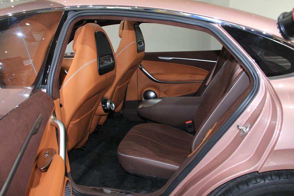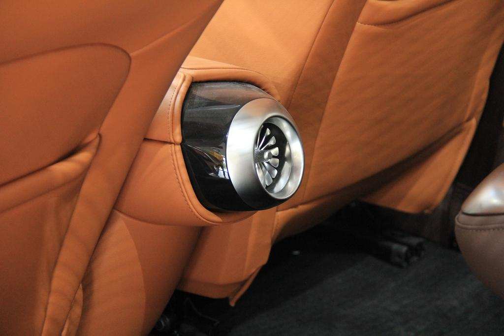 闪电猫的后排采用了两座布局,且中间还有一个固定的扶手箱。后排座椅和前排的风格相近,也是造型偏运动,但质感偏重舒适和豪华。而在前排扶手箱的后面,则是一个类似飞机发动机风扇一样的后排空调出风口,整体造型有很强烈的机械质感。