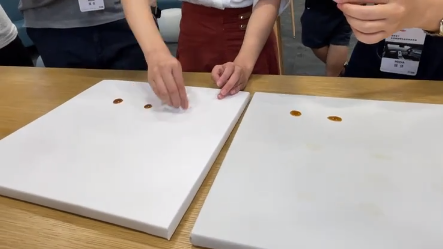 易清洁性:在现场的易清洁性试验环节,工作人员先将咖啡滴在LUXSENSE™️有机硅皮革上,随后滴在其他车用皮革上,一段时间后分别擦拭,可以明显看出其他车用皮革留下了浅色印记,而LUXSENSE™️有机硅皮革依旧如新。
