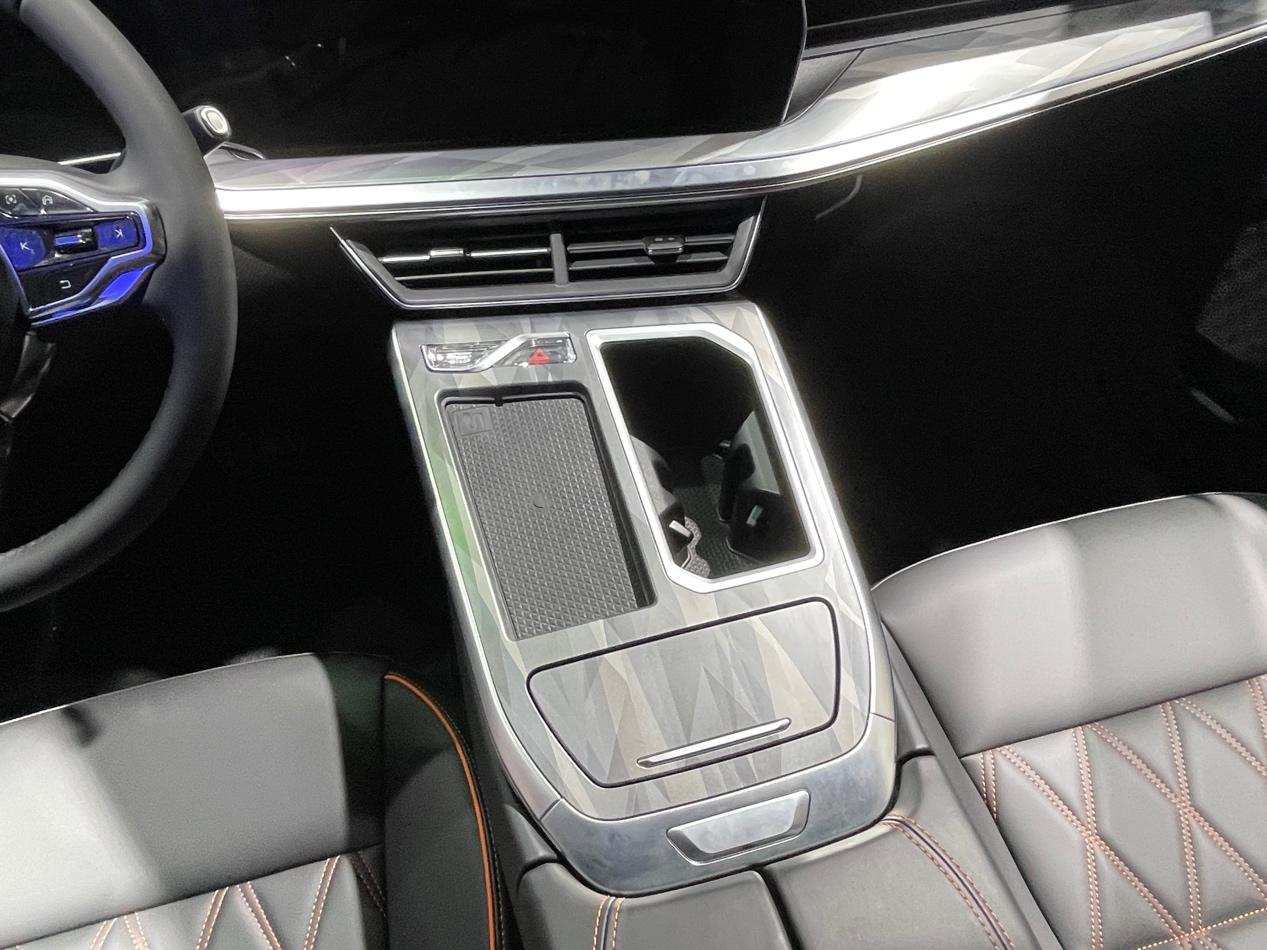 12.3+14.6英寸双联屏是内饰设计的核心,造型像一把吉他或者放倒的汽水瓶。中控台向驾驶员一侧倾斜,进而向下延展到空调出风口和中央地台区域。神兽没有采用常规地排挡,而是更「显高级」的怀挡,这样一来就能腾出排挡杆区域安装无线充电模组,也让整个地台更清爽规整。