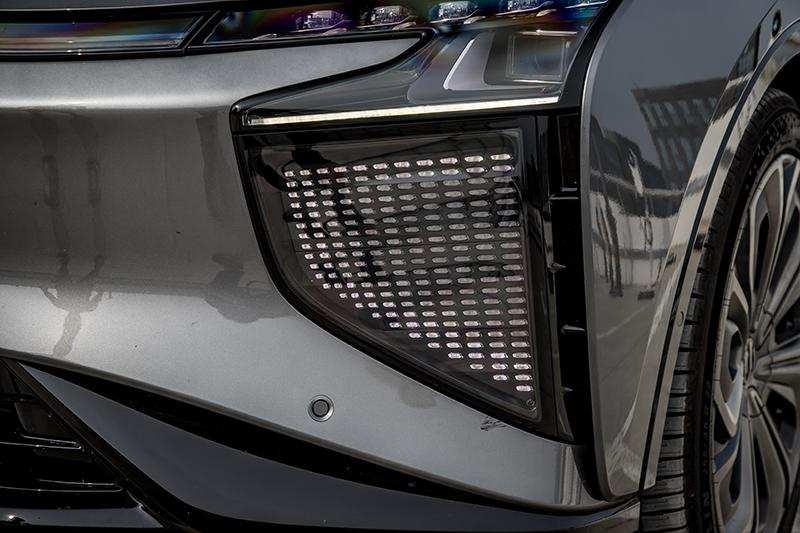 编程大灯下面的是ISD交互面板,可以显示图案、表情。比如说我在驻车时打了转向,车外面的行人一看车身四角的4块面板,就知道我要转弯或者掉头了。