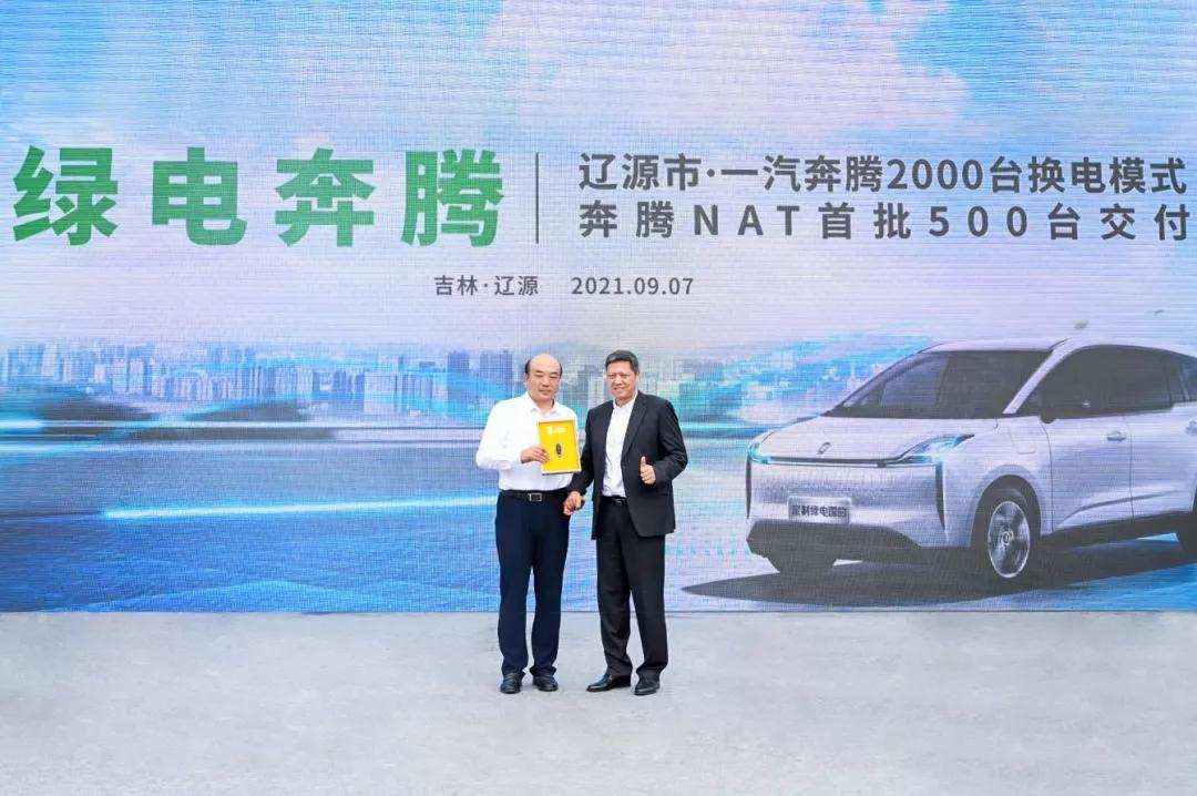 9月7日,一汽奔腾与辽源市联合推广换电模式新能源汽车项目正式启动,首批500辆奔腾NAT正式交付辽源市,该项目共计需交付2000辆。