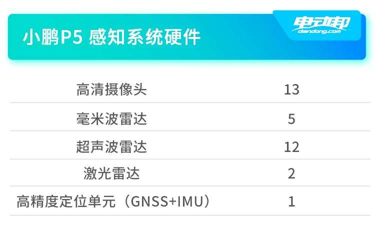 简单来说,小鹏P5的「黑科技」由硬件+平台两部分组成。其中感知硬件多达33个,包括2个激光雷达、12个超声波传感器、5个毫米波雷达、13个高感知摄像头、1套高精定位单元,如此「堆料」的结果就是小鹏P5全车感知硬件比特斯拉Model 3多出了10个。另外,小鹏P5也是全球首款搭载激光雷达的量产车。