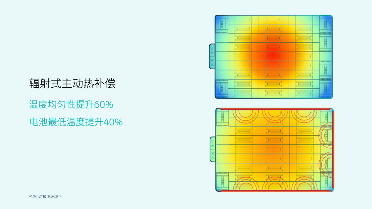 除此之外,为了让磷酸铁锂尽可能地告别低温,蔚来为电池包做了全散热路径物理阻隔,并且给予了辐射式主动热补偿,蔚来的目标是,无论外部温度如何,要将电池包内部温度控制在最低-5℃以上,这样在车辆开始行驶大约10分钟之内,整体就能升温到适宜电池性能释放的程度。