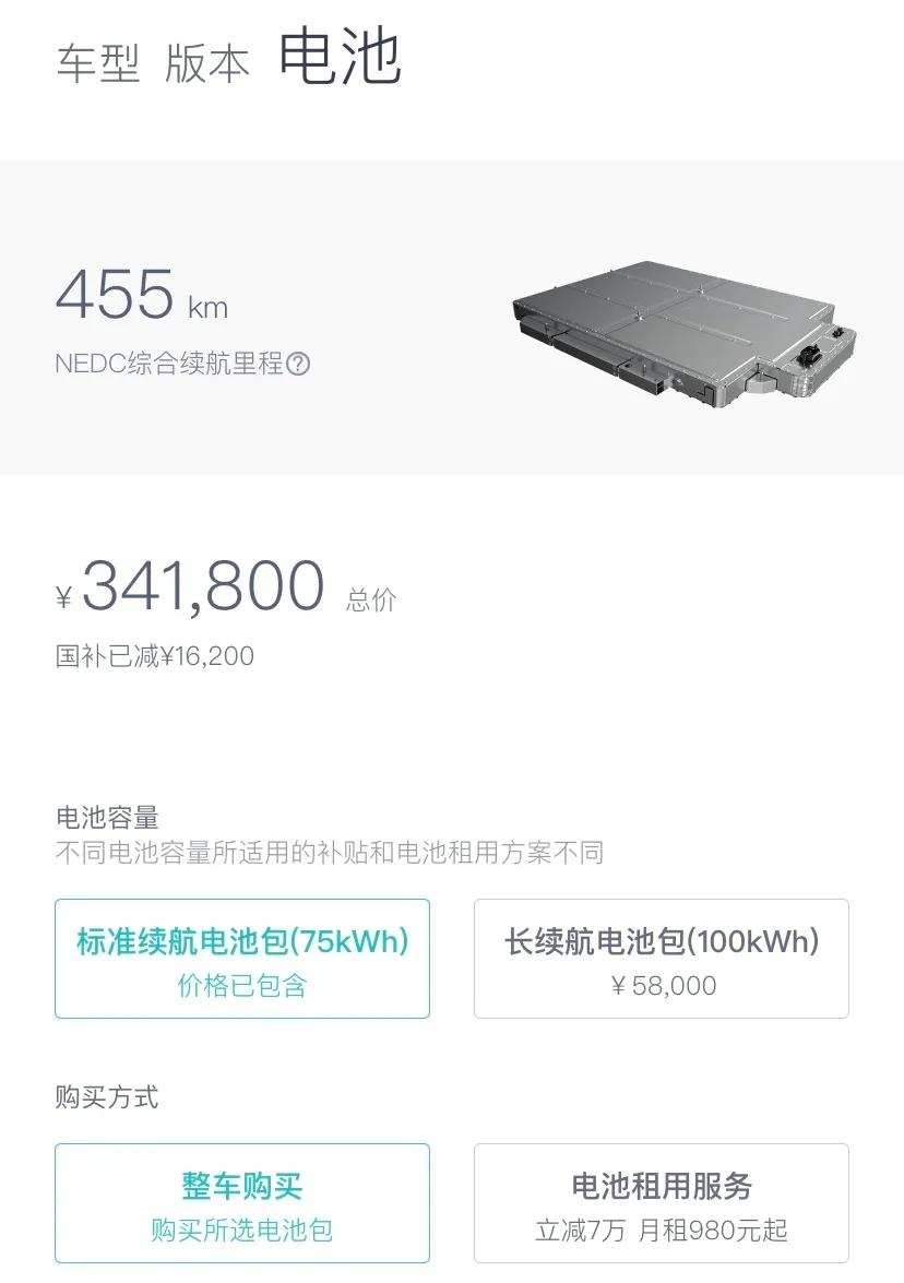 发布会后,蔚来新购车用户便可以选择三元铁锂标准续航电池包(75kWh)或三元锂长续航电池包(100kWh)。选择三元铁锂标准续航电池包(75kWh)的用户,预计将于今年11月开启交付车辆。