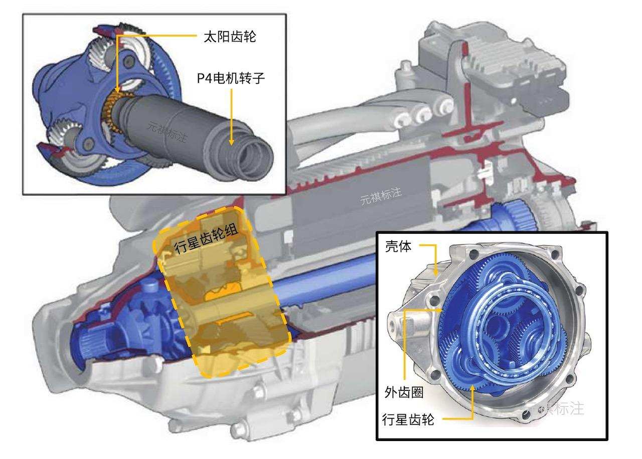 3. 「太阳齿轮」作为是「P4电机」转子轴的一部分,并可通过「离合器」与其余旋转部件上分离。