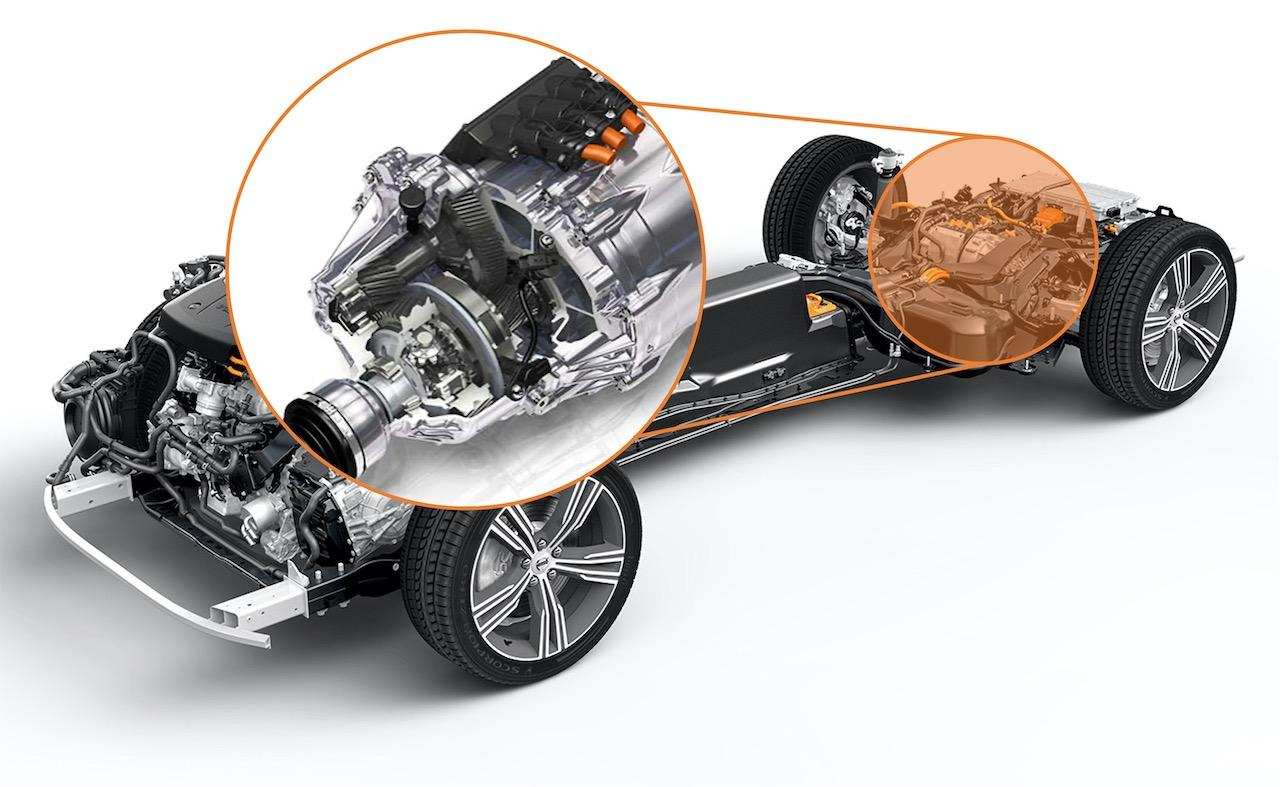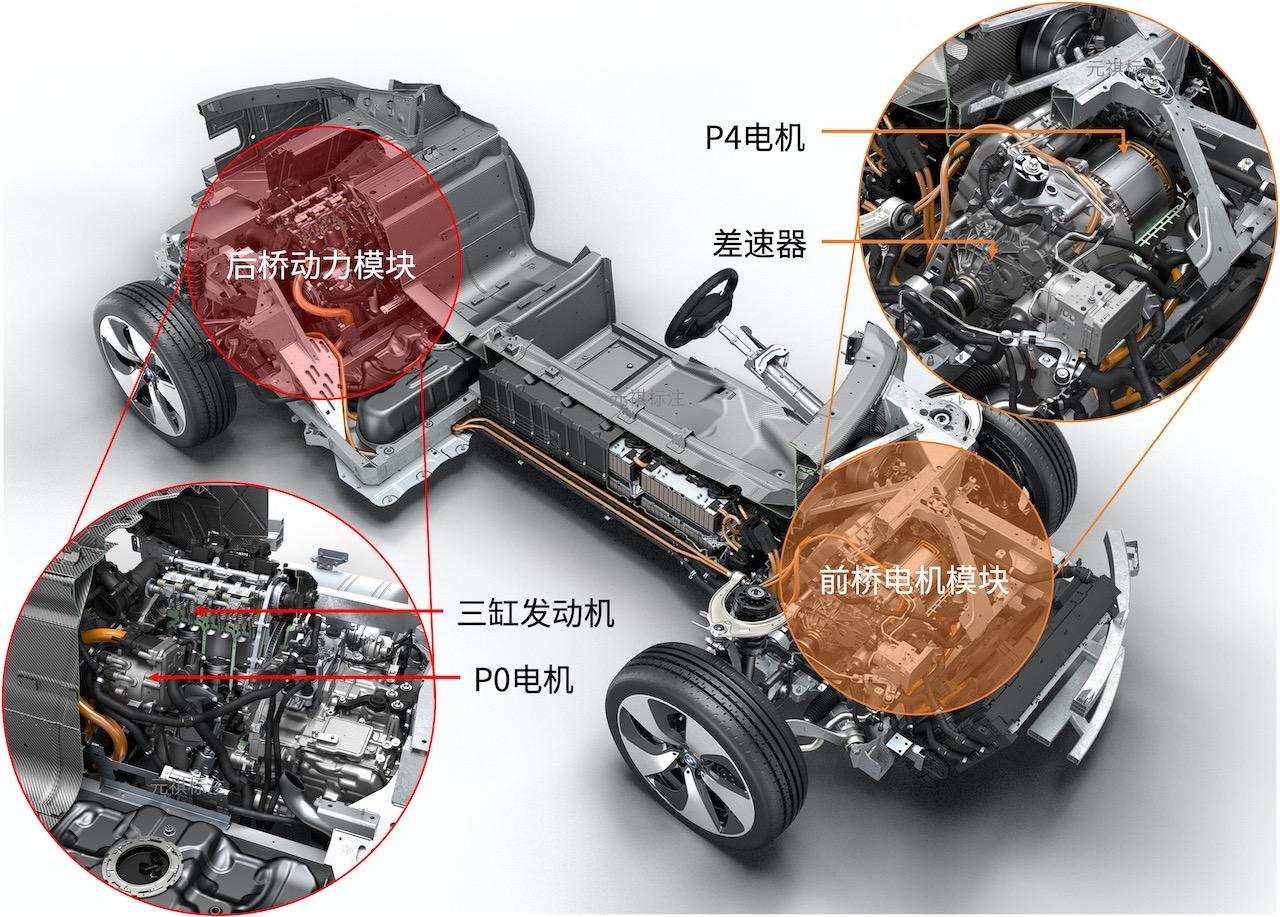 其主要构成部件为一颗2.0T Drive-E「发动机」,一颗与「发动机」的「曲轴」集成的「P1电机」(ISG发电机),配合在「P1电机」后方的8速「自动变速器」,三者构成了「前桥」的动力总成。