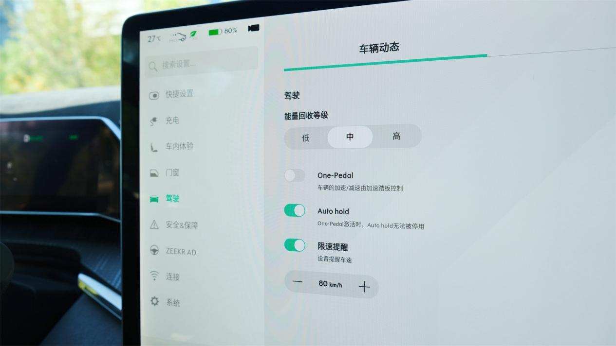 动能回收:和大多数纯电车一样,ZEEKR 001动能回收分三挡,除了「高」档有较强的拖拽感,「低」「中」档会更类似油车的滑行感受,如果「高」档还不能满足你的需求,可以直接打开下方的One-Pedal单踏板模式。