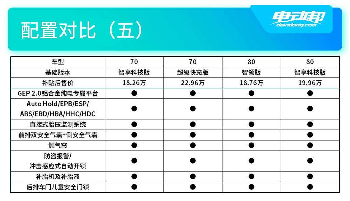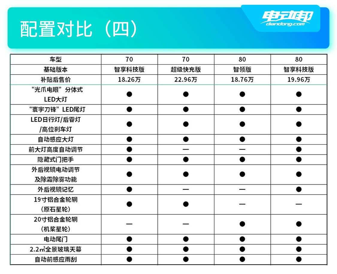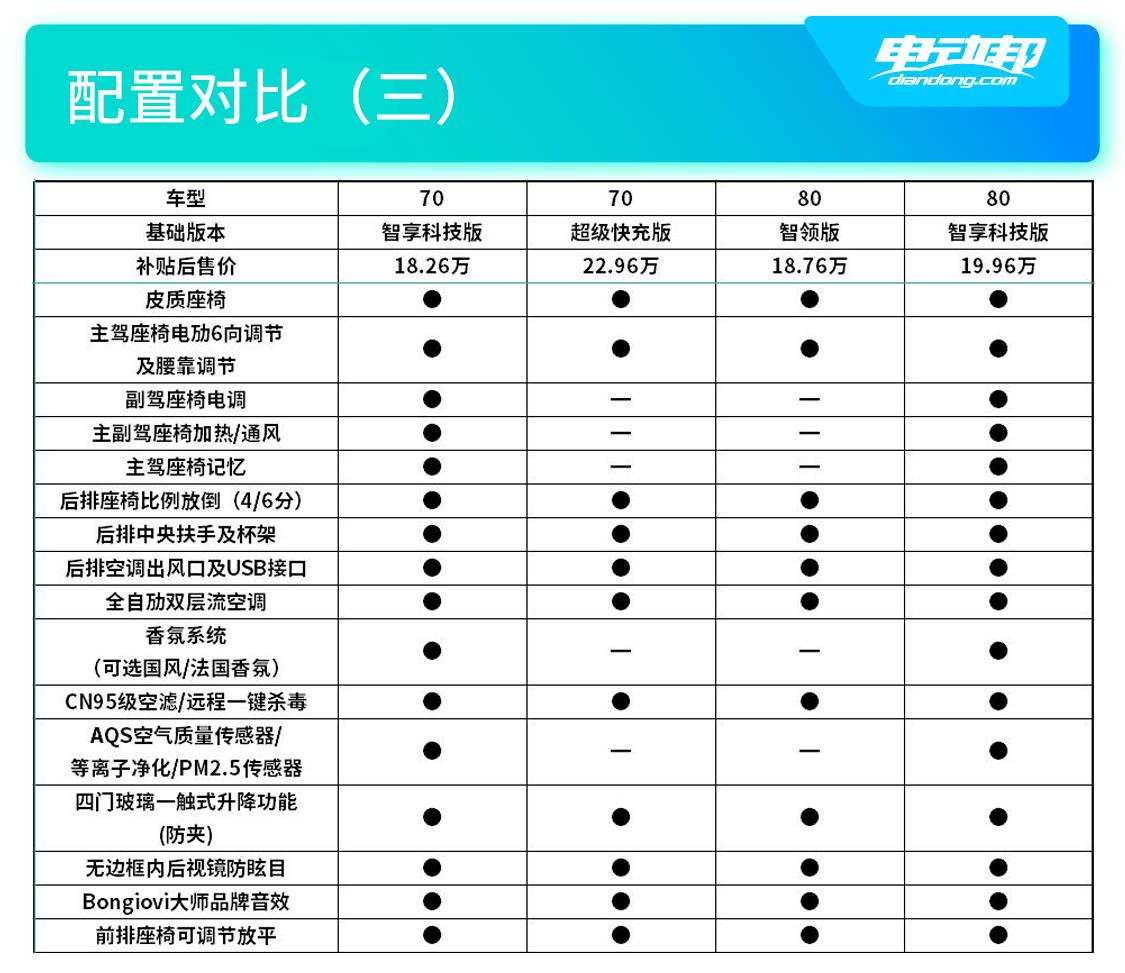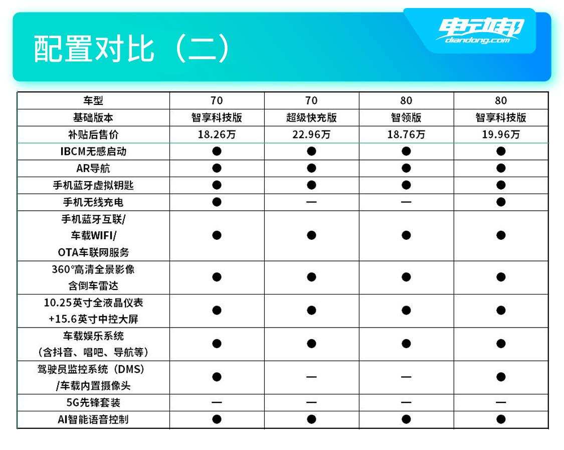 其中“70”系列的入门级“70智领版”售价为17.26万元;中配车型“70智享科技版”18.26万元;而顶配“70超级快充版”售价22.96万元。由此可见,入门版和中配相差1万元,但顶配版却比中配贵了4.7万元。