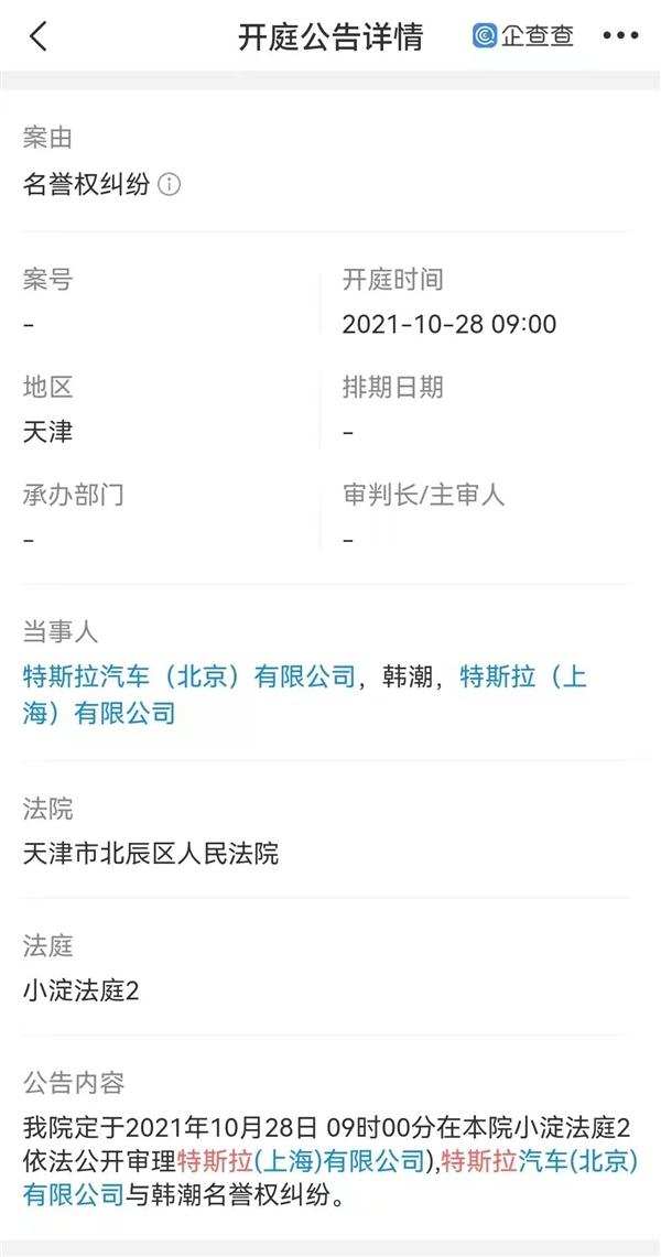 天眼查App显示,近日,特斯拉(上海)有限公司新增开庭公告信息,相关案件为该公司(原告)与车主韩某(被告)的名誉权纠纷案,开庭日期为10月28日,审理法院为天津市北辰区人民法院。