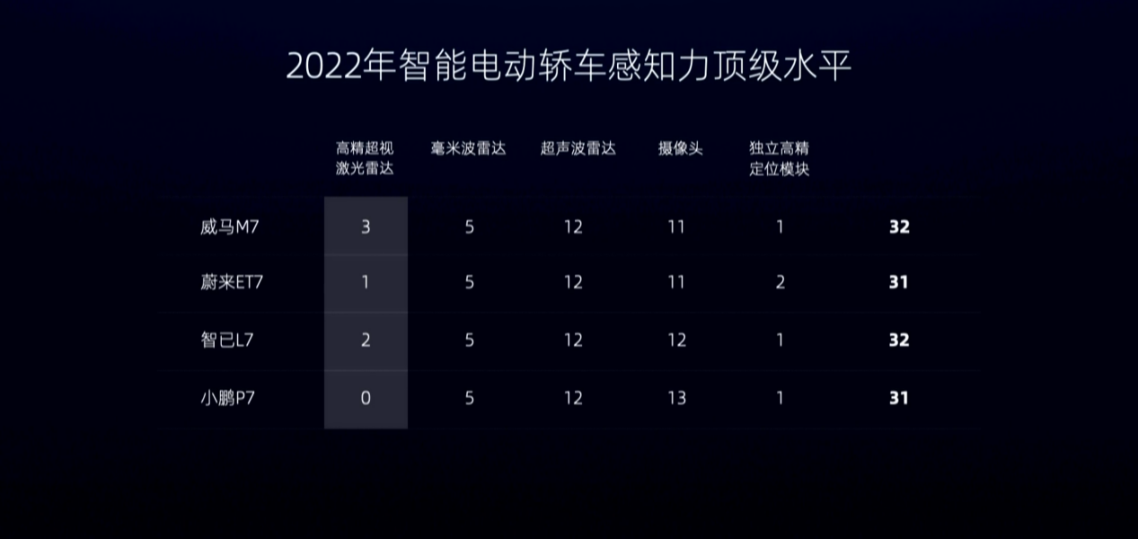 辅助驾驶硬件方面,威马M7的装配是非常齐全的,全车共有 32 枚传感器,与其他三位『7系』平分秋色,但3颗激光雷达的存在,让大家对它的期待值变得更高了些。