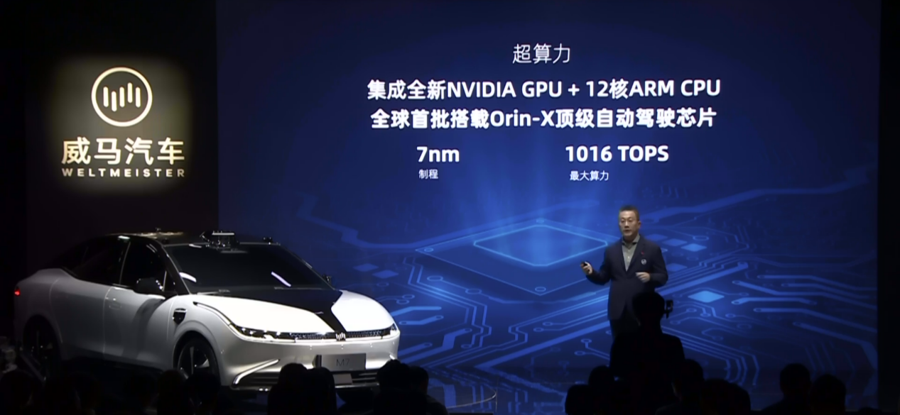 另外,官方宣称在威马M7上,将搭载7nm规格的NVIDIA DRIV Orin-X 芯片,单枚Orin-X 芯片算力可达254TOPS,每秒可计算254万亿次,最大算力高达1016TOPS 。