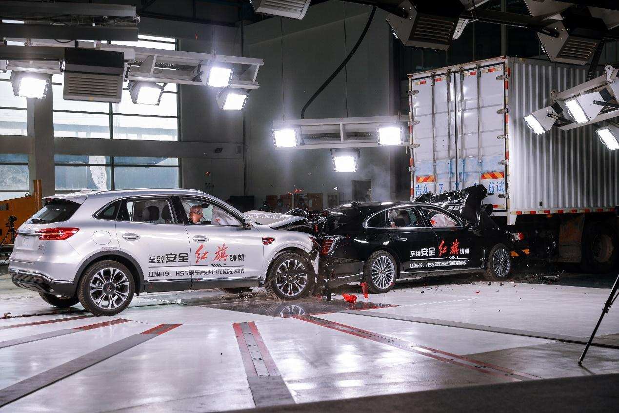 其中双车高速追尾碰撞是全球“首试”,中汽中心选择了“共和国长子”一汽红旗的旗舰轿车H9和SUV车型HS5进行演示,从测试结果看两辆车都表现出优秀的车身素质,尤其是遭遇“前后夹击”的红旗H9,哪怕一头“扎进”卡车下面,然后再被后面的车追尾,车身主体也并没有明显的形变,车门部分也很完好。