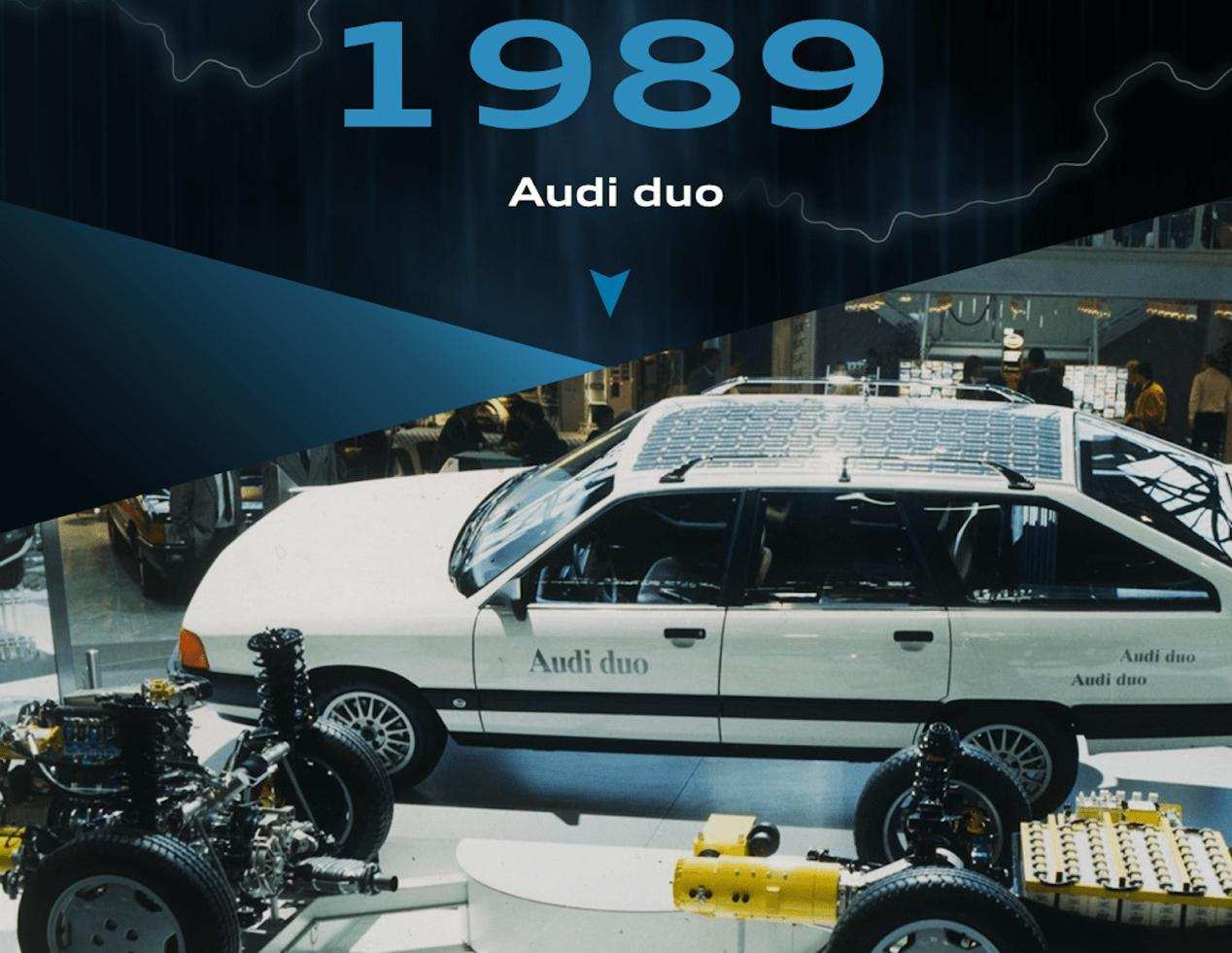 奥迪的电动化进程起始于1989年,那一年奥迪推出了首款混动概念车“奥迪duo”,有意思的是,“duo”在德语里有“双重奏”之意,英文中则是“搭档”,形容混合动力再恰当不过了,而这也让奥迪品牌成为了最早的“新能源阵线玩家”。进入90年代之后,奥迪又相继推出了第二代、第三代“奥迪duo”,它们都是基于奥迪旗下不同类型的Avant版本进行研发。来到千禧年,奥迪加速了电动化技术的探索,2005年德国法兰克福车展上首次推出了Q7 Hybrid。在这款车上,真正实现了电动机与发动机共同驱动。接着2007年推出首款小型插电式混合动力概念车Metroproject quattro。2012年-2015年这3年期间算是奥迪电动化的高速阶段,2012年奥迪带来了独特的油电混合式四驱系统的Q5 Hybrid Quattro。随后几年,奥迪迅速完成了从混合动力到纯电时代的过渡,推出了e-tron、Q2L e-tron等纯电产品.这也代表着,奥迪正式宣布老牌豪华品牌在纯电领域正式下场的决心。