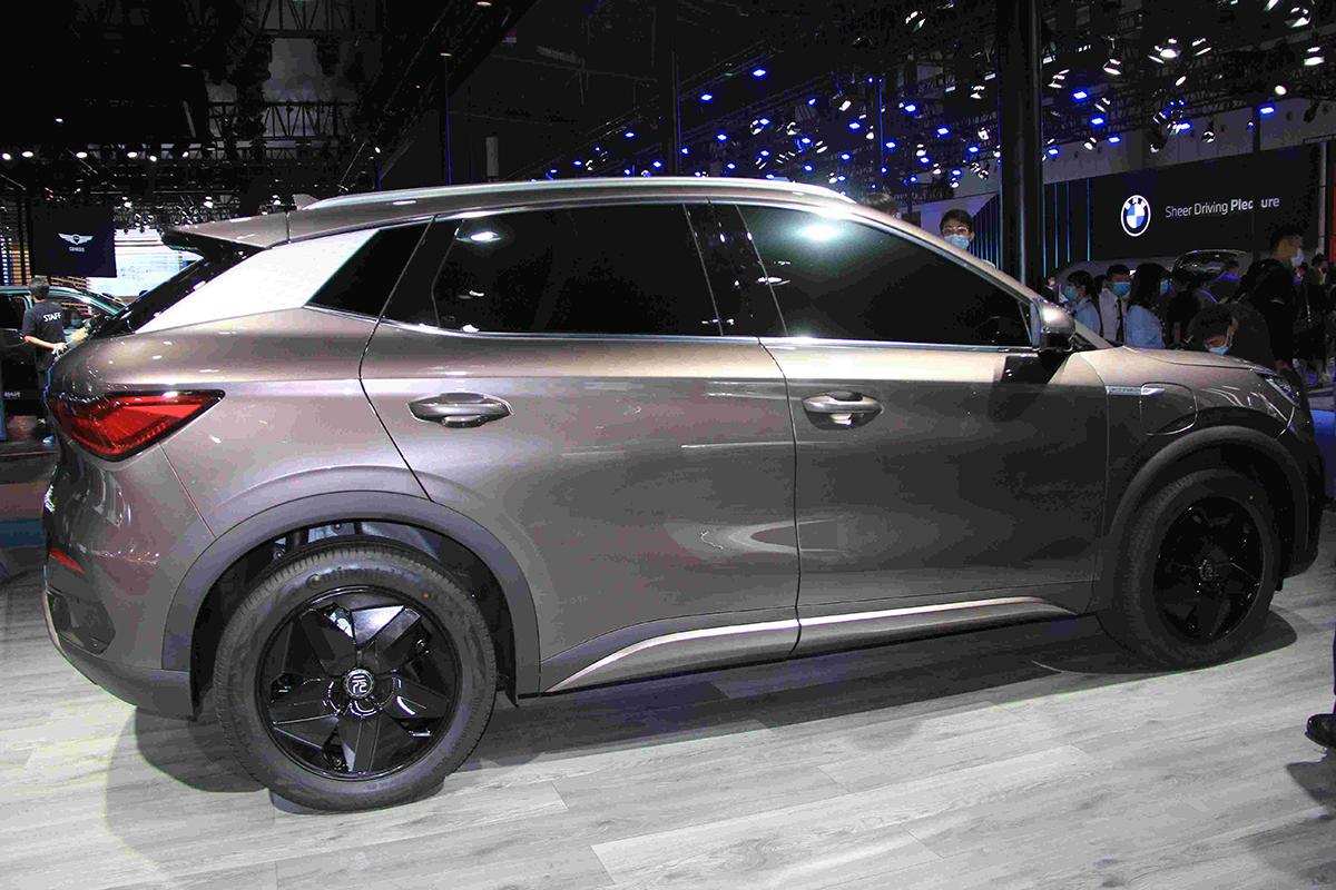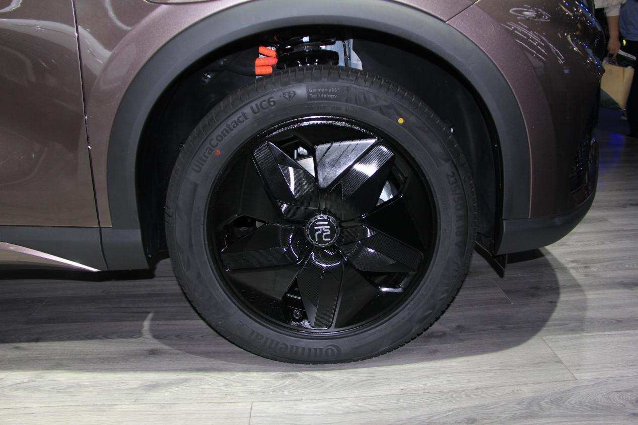 新车侧面一条腰线从车头贯穿至车尾,营造出更为修长的视觉效果。此外,展车还配备了黑色封闭轮圈并使用了235/50 R18的Continental UC6 SUV轮胎,并使用了一个18寸的熏黑五幅式轮圈。