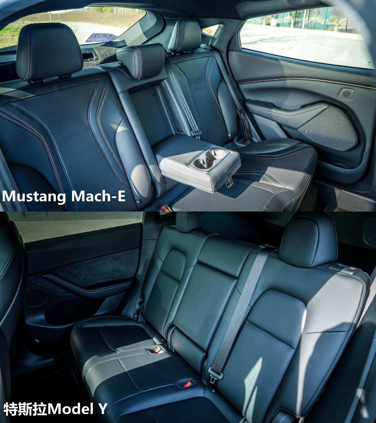 对于一台车的乘坐空间来说,「轴距」往往起着举足轻重的作用。从数据上看,特斯拉Model Y轴距为2890mm,Mustang Mach-E轴距为2984mm。邦老师实际体验下来,多出来的94mm轴距确实为Mach-E带来了更为宽敞的前后排空间。而且由于采用了打孔真皮以及侧向支撑,Mach-E的后排座椅舒适度和包裹感也更为出色。此外,Mach-E保留了后排中央头枕,安全重视程度值得点赞。