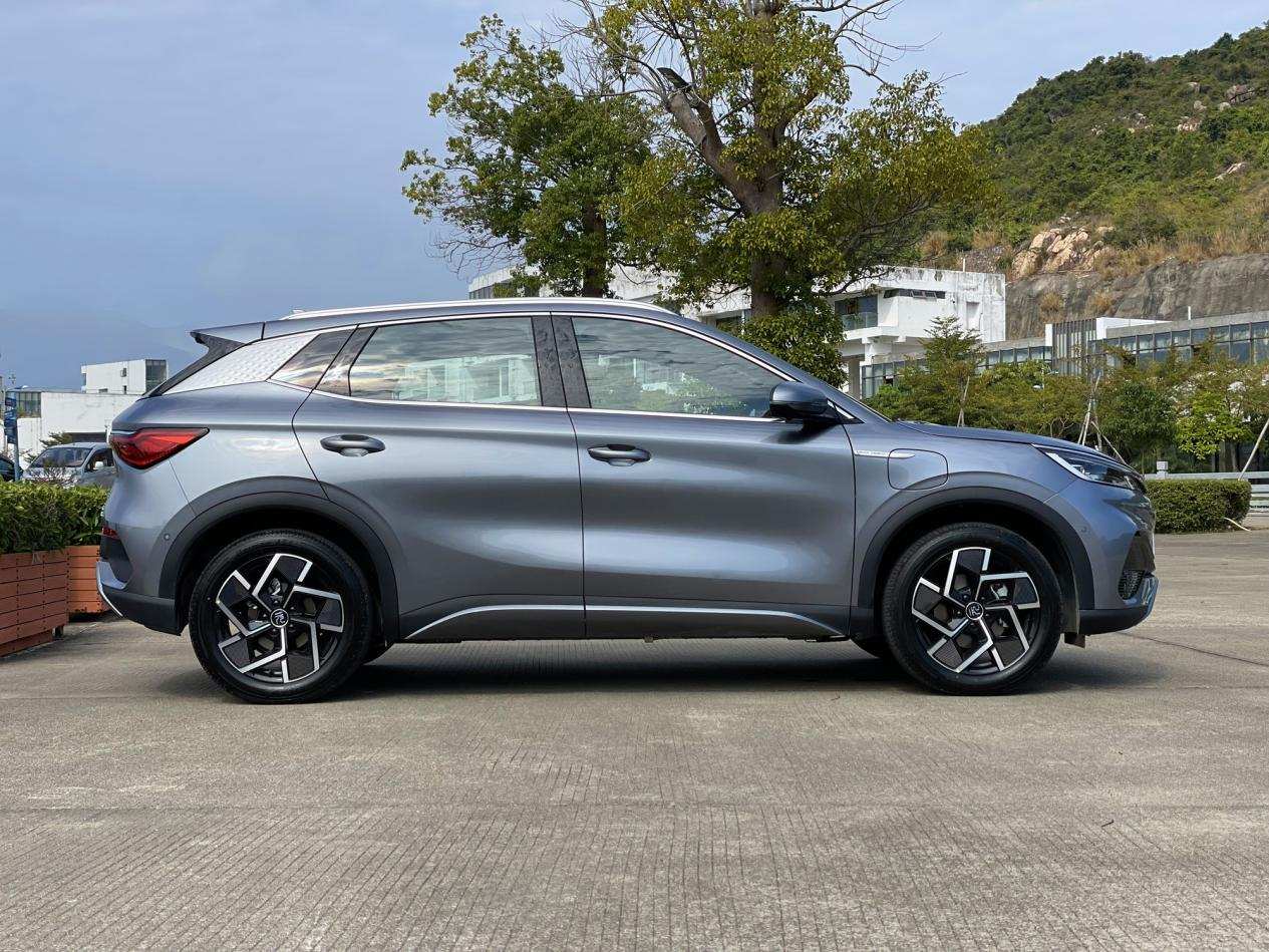 来到车身侧面,可以看到元PLUS变得更加修长了,并且这台车还装配了很有科技感的18英寸『风之翼』轮圈,不过我们预计这项配置只会出现在高配车型上,好看的都是要加钱的。往后延伸的D柱部分,有着国潮韵味十足的银色『龙鳞』饰板,悄悄为元PLUS注入神秘的东方力量。