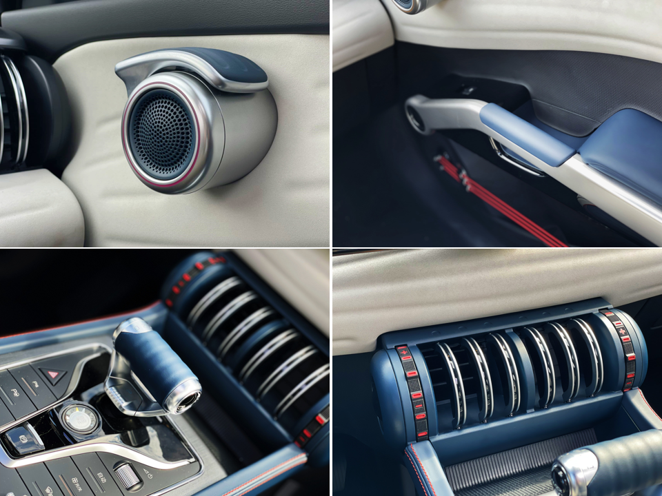这套内饰绝对能引起「撸铁狂魔」们的强烈共鸣:哑铃式的空调出风口;握力式的门把手,还顺便『兼职』扬声器与氛围灯;跑步机式的中央扶手台;推力式的电子挡杆;琴弦式的红色门板装饰件,关键是我还特地试了试,真能弹出『Do-Re-Mi』三个音。想象一下,开着这台车,既能撸铁,还能奏乐,文体两开花,实在是妙啊!