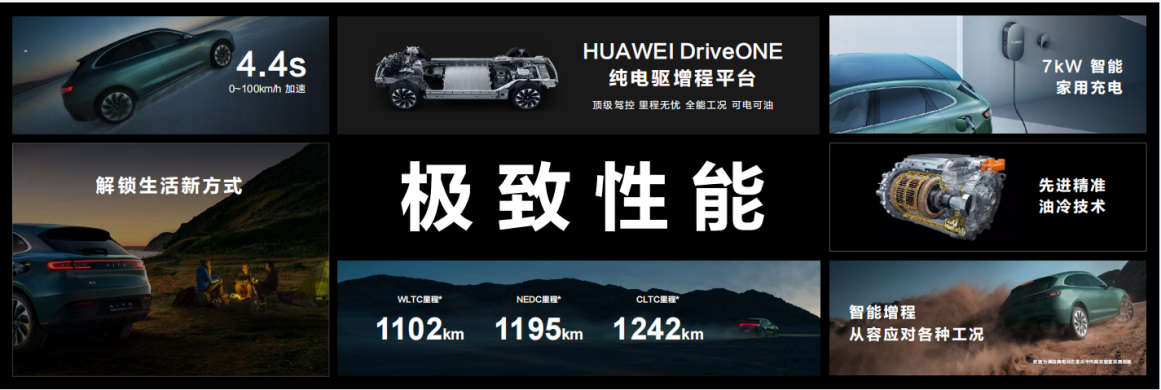 动力部分,四驱旗舰版AITO问界M5在HUAWEI DriveONE纯电驱增程平台的基础上,将原本的后置单电机变为了一套由前异步交流电机与后永磁同步电机组成的智能四驱系统,综合功率达到365kW,百公里加速时间仅需4.4s,同时该车型具备5种驾驶模式、3种增程模式、4档回收力度自由调节,让驾驶更智能。电池部分,新车匹配40kWh三元锂电池,WLTC综合续航最高可达1000km+,纯电续航最高可达到150km,可远可近,可油可电。