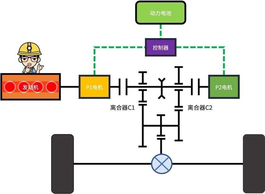 并联模式:当需要较大扭矩时,那么所有能驱动的单元则必须全部参与,「离合器C1」闭合,「发动机」直接接入驱动,「P1电机」在「发动机」的带下持续发电,必要时直接为「P2电机」供电,「P2电机」并联介入驱动;