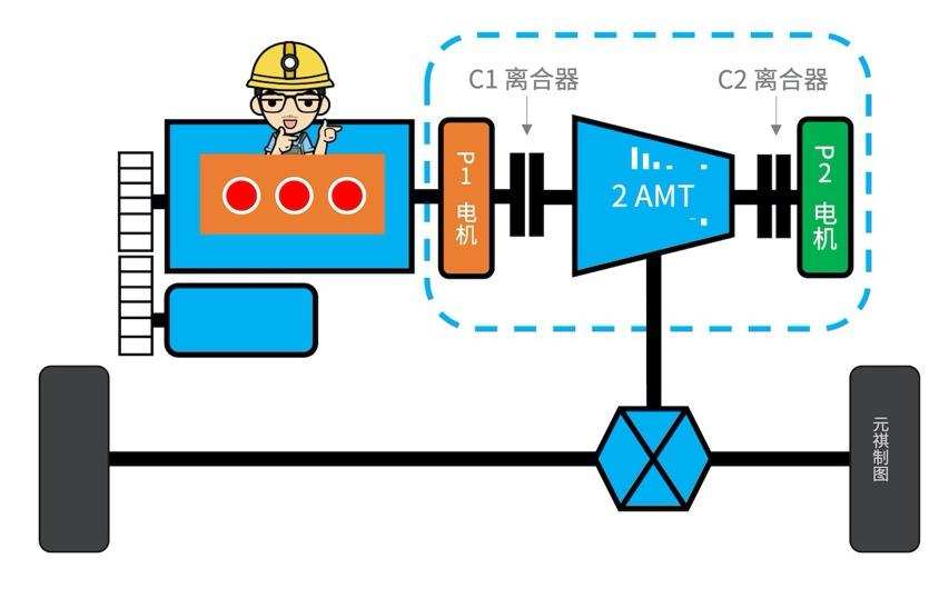 三大动力组件被两套「离合器」、一组「同步器」以及若干变速齿轮等组件相连接。其中第一组「离合器C1」控制「发动机」接入整个系统,而「离合器C2」长期处于闭合状态(后文详解),主要负责将「P2电机」的功率接入到系统中。