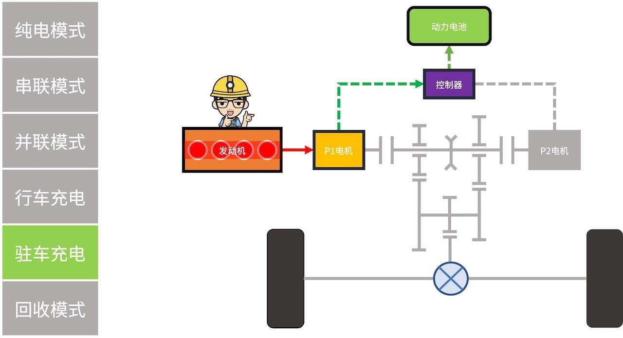 驻车充电(怠速充电):当车辆处于静止状态,且「电池」电量低于规定值时,「发动机」怠速带动「P1电机」,为「电池」充电补能;