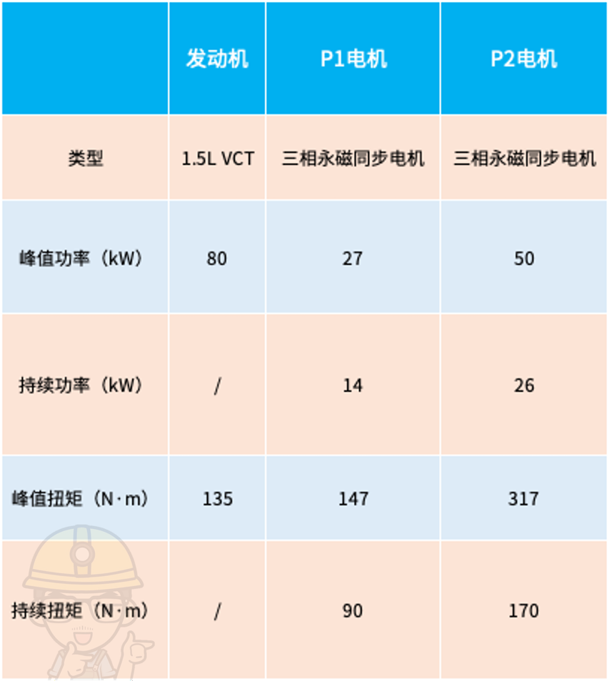 第一代「上汽EDU混动系统」的代表车型为荣威550 Plug-in,以2013年「荣威550 Plug-in」(2014款旗舰版)为例,其配备了一枚1.5L的「发动机」(并不是1.0T的三缸机哦~),其最大功率为80kW,「P1电机」和「P2电机」的最大功率为27kW和50kW,从参数上看,动力性能较比亚迪第一代的「DM混动系统」强了不少,但额定的持续输出功率和扭矩却依然保留着那个年代的味道,估计也是考虑到燃油经济性的问题。