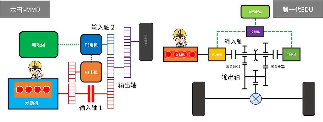 由于「本田i-MMD混动系统」使用三条平行轴,双电机可以上下放置,利用了纵向空间。而第一代「上汽EDU混动系统」是两条轴,两个「电机」无法上下放置,故此,横向空间很难得到优化。这也为第二代「上汽EDU混动系统」的诞生埋下了伏笔。