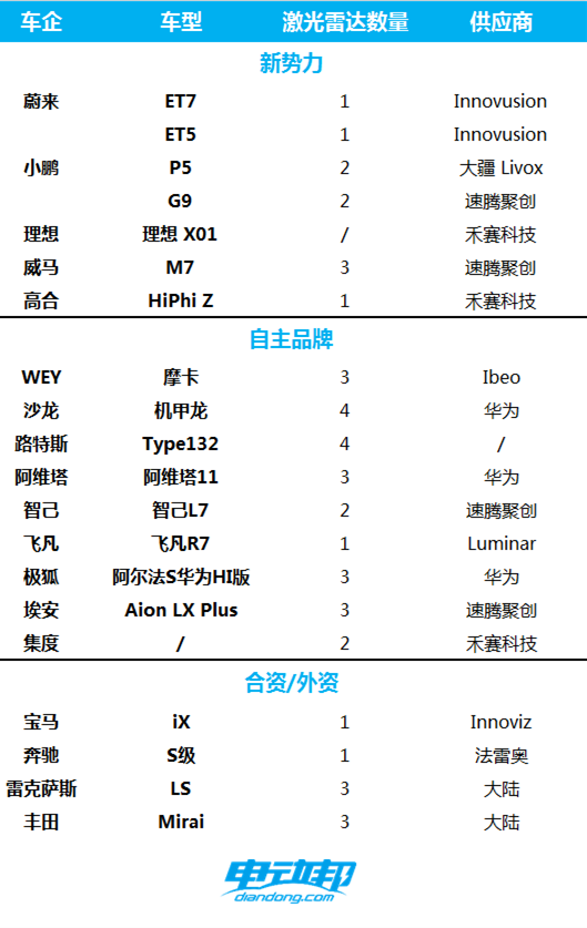 通过对市场上搭载「激光雷达」的车企梳理,我们发现打头阵的几乎都是新势力。同时,自主品牌在智能驾驶的布局节奏也快于合资、外资品牌,而且价格更低,这一定程度上对传统巨头的转型造成了精准打击。大部分搭载「激光雷达」的自主品牌车型价格位于15-40万元之间,相比之下,搭载同样方案的外资品牌丰田Mirai、奔驰S级、宝马iX等车型的起售价均在50万元以上。