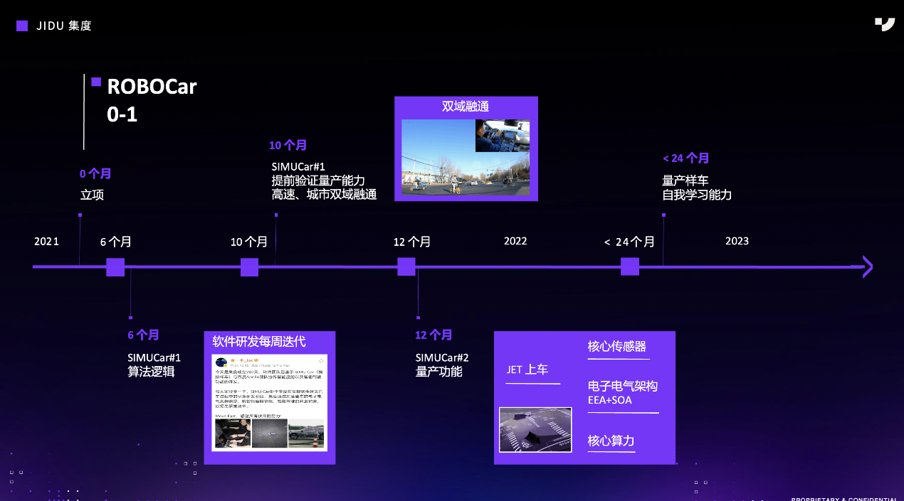 集度智驾负责人王伟宝表示,「SIMUCar 1.0」阶段像一个人的小学阶段,是打好基础的关键期,更专注于自动驾驶的基础能力建设,包括软件架构和相关基础功能逻辑的开发,并与底盘适配。「SIMUCar 2.0」则像中学阶段,是逐渐提升并形成基础能力的时期,在这个阶段,SIMUCar的底层架构已升级为集度自研的高阶自动驾驶智能化架构JET(JIDU Evolving Technology),包含电子电气架构EEA和整车操作系统SOA。此时,相关的域控制器和传感器,已逐渐达到量产状态,一些基础的自动驾驶能力,包括ADAS功能,泊车,智能交互等,都会逐渐达到量产状态。