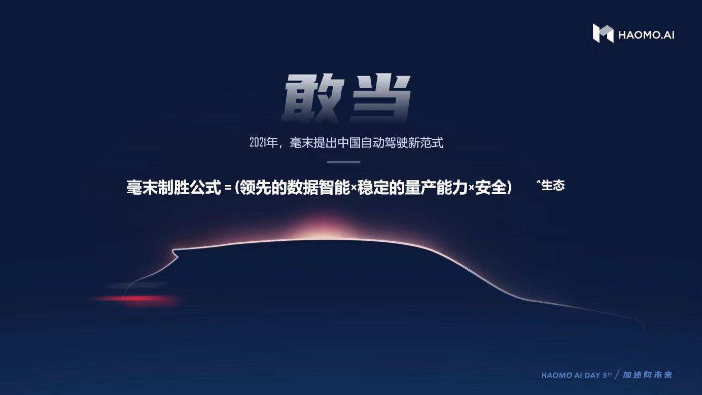 当然,企业只有发现或者及时把握住这些机会,才能体现其中的价值,而毫末智行就是借此时机加速前行的品牌之一。在2021年,毫末智行提出了一个“制胜公式”,就是用领先的数据智能体系乘以稳定的量产能力乘以安全,之后再乘上生态的N次方,而毫末智行就是通过它实现了前面提到的成绩。