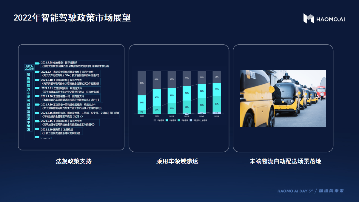 首先在国家政策层面,2021年相关部门出台了多项制度和政策,支持并规范了自动驾驶技术的快速落地。而在市场成熟度层面,消费者对高级智能驾驶辅助功能的认知和接受度越来越高,已经成为很多人选车的必备“门槛”,另外据相关数据统计,2021年乘用车高级别智能驾驶的渗透率已经超过了20%。