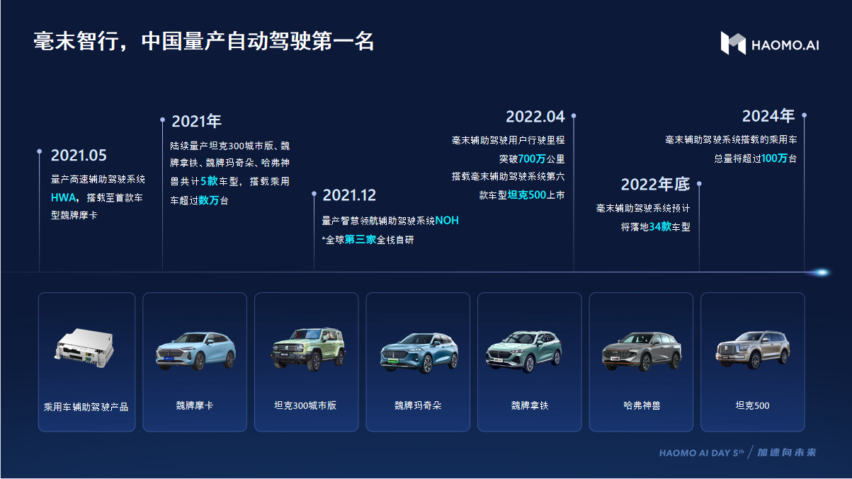 首先,毫末智行董事长张凯为我们分享了企业去年以及今年目前为止在市场上的收获。他表示毫末智行自2021年5月搭载毫末智行HWA高速智能驾驶系统的首款车型魏牌摩卡上市后,毫末又陆续在坦克300、拿铁、玛奇朵、哈弗神兽等5款车型上实现了量产搭载,并于2021年11月顺利推出高速领航智能驾驶系统NOH,而搭载了毫末NOH系统的魏牌摩卡,成为了世界首款具备领航智能驾驶功能的燃油车型。