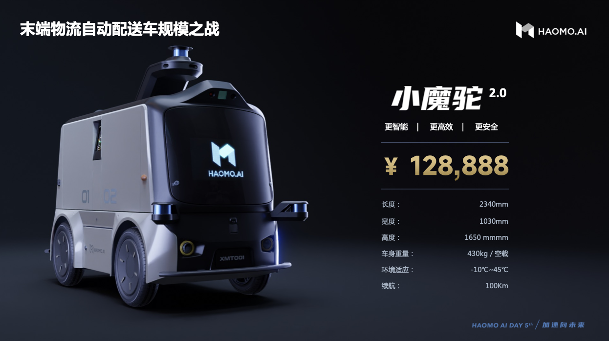在本次的“AI Day”上,毫末智行正式发布了第二代末端物流自动配送车——小魔驼2.0,售价为128888元。这款配送车长宽高分别为2340/1030/1650mm,续航100km,能适应-10℃至45℃的环境。