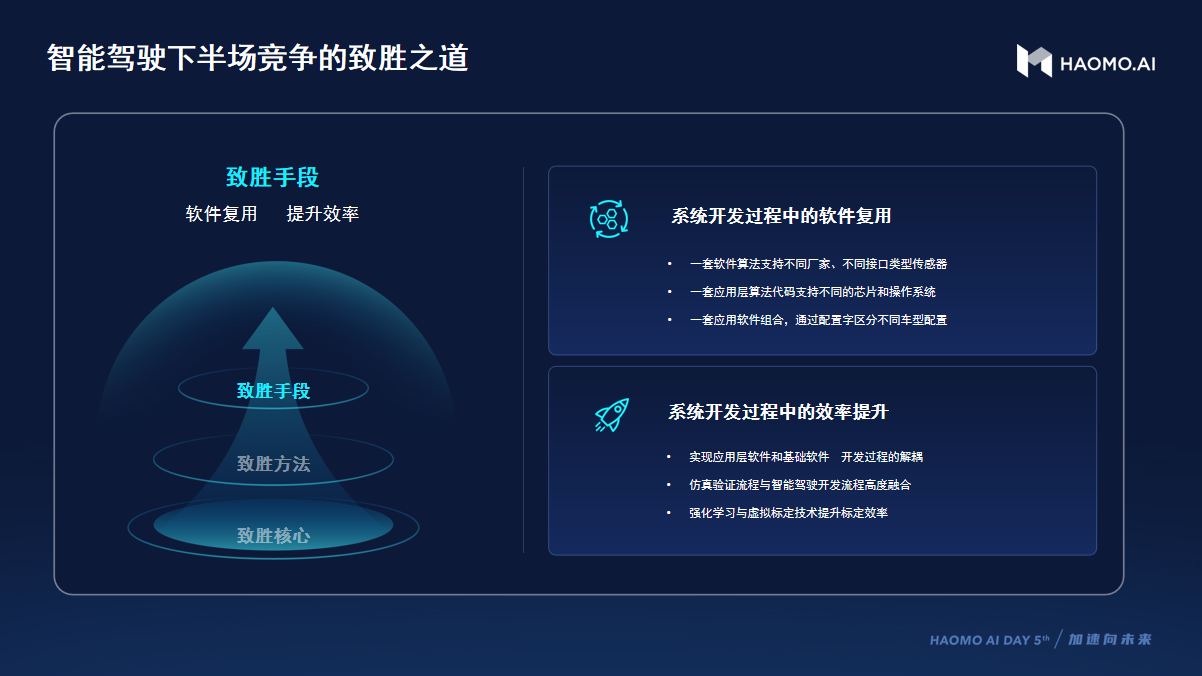 最后张凯表示,为了取得三大战役的胜利,还需要解决多项目并行和技术人员不足的问题。为此毫末智行采取了极力提升系统开发过程中的软件复用程度、在系统开发的各个环节提升效率、节约实车标定时间等策略,简单来说就是“重复利用+提高效率”。他们希望通过这些策略,能够完成2022年搭载34个车型,完成78个项目的目标。