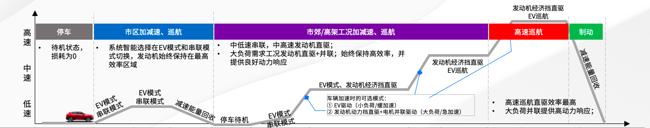 新一代混动变速器还有一个特点,就是所有的工作模式都会被合理地对应不同速域,不同功率需求的工况,也就是我们常说的『全速全域』。以「哈弗神兽」车型为例。