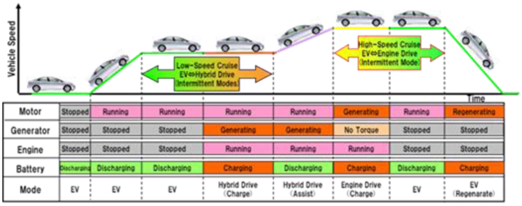 在市区通勤时,车速相对较低,一般在35km/h以下,系统会将驱动的任务主要交给「驱动电机」,智能地在纯电模式和串联模式下切换,「发动机」开启后主要用于发电,且始终保持在最高效率的工作区间;在市区道路比较通畅,需要快速提升车速时,「发动机」便通过1挡齿轮组介入驱动;而当我们要进行超车急加速时,系统切换至并联模式,油电共同驱动,提供强劲的动力;在高速路段行驶时,系统切至「发动机」直驱2挡,进行直驱。