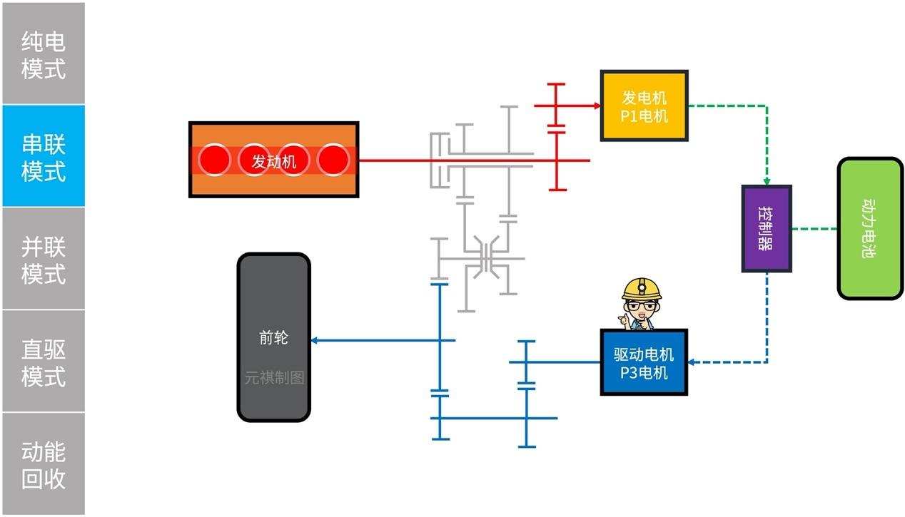 但论整套混动系统的效率,情况就发生了变化,由于「发动机」与「电机」无法脱离,在纯电行驶过程中,「行星齿轮机构」会随之转动,导致一定的动力损耗。而为了满足大的功率需求,「发动机」必须提高转速,走出最优的工作区间,最后降低了系统的燃油经济性。这就好比三个人参加拔河比赛,但其中两个人关系不好,必须有一个人调停,最后就成了两个人出力,一个人做啦啦队。