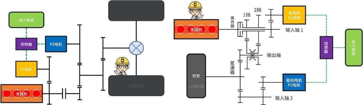 本田i-MMD混动系统与哈弗柠檬混动DHT系统结构对比示意图