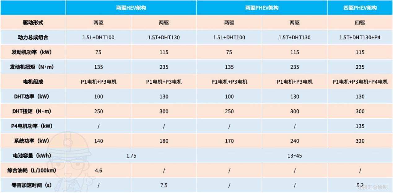 专栏曾介绍过长城汽车有一套名为「Pi4」的混动系统,其前桥使用了「P0电机」用于「发动机」启停,而后桥则使用了一个可以两挡变速的电驱后桥(即『P4电机+两挡变速机构』),显然在这方面的经验积累被带到了「哈弗柠檬混动DHT系统」。