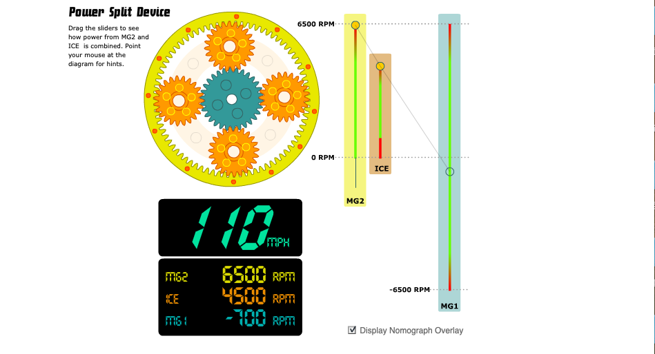 我们可以通过网上某大神制作的「功率分流原理」网页软件(基于「模拟杠杆法」,链接放在了文末),如上图当主要负责驱动的「MG2电机」与「发动机」转速拉满时,「MG1电机」必须反转(即图中的-700RPM)进行调速,而不能发挥出最大的发电效用。