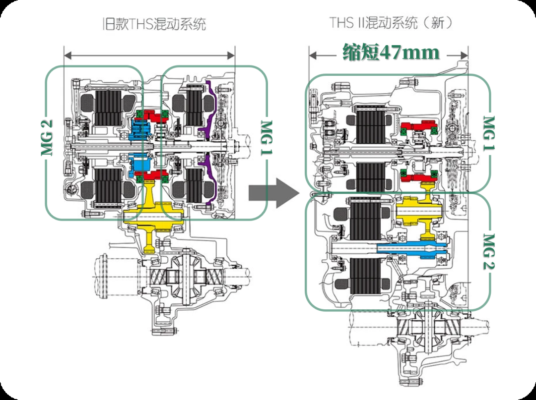 此后,丰田为2009年的三代「普锐斯」搭配了动力更强的1.8L「发动机」以及更大功率的「MG2电机」(60kW)。而2015年第二代「丰田THS混动系统」迎来了一次结构性的大升级:将原来为「MG2电机」减速的第二组「行星齿轮机构」,改为结构更简单的平行轴齿轮,由原来的三个动力源平行布置,转变为了并列布置。